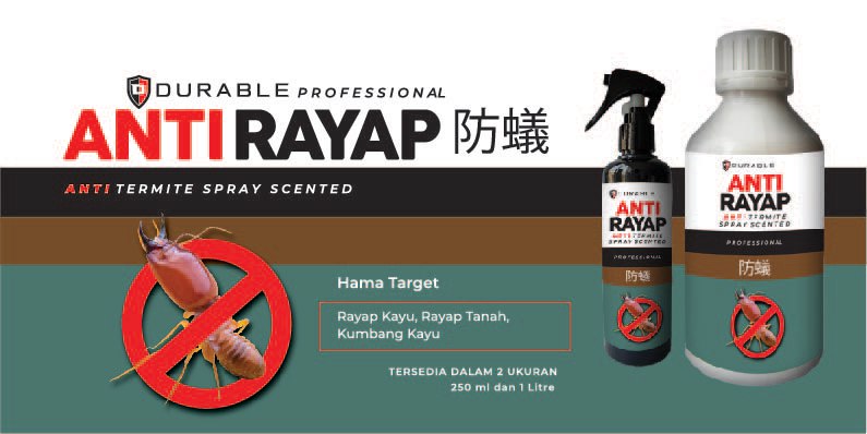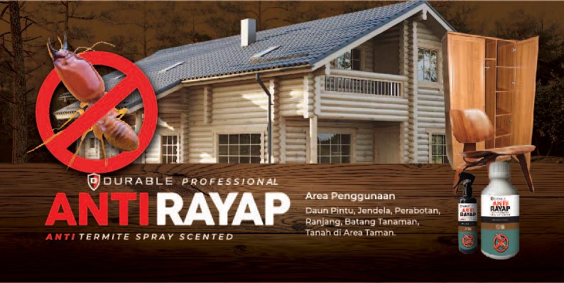 Dengan Durable Anti Rayap, Anda bisa mencegah kerusakan pada rumah maupun furnitur Anda dengan mengusir rayap. Durable Anti Rayap dapat digunakan sebelum ataupun sesudah adanya rayap. Jika belum ada rayap, cairan ini akan membantu mencegah kehadiran rayap, sedangkan jika sudah ada rayap, cairan ini akan membantu mengusir rayap-rayap tersebut.
