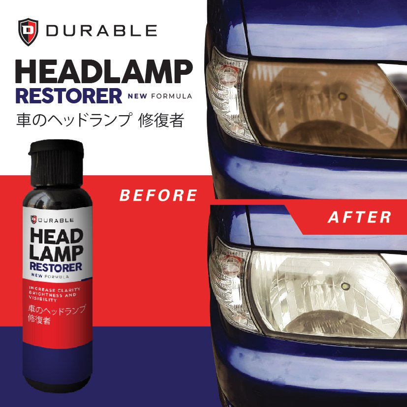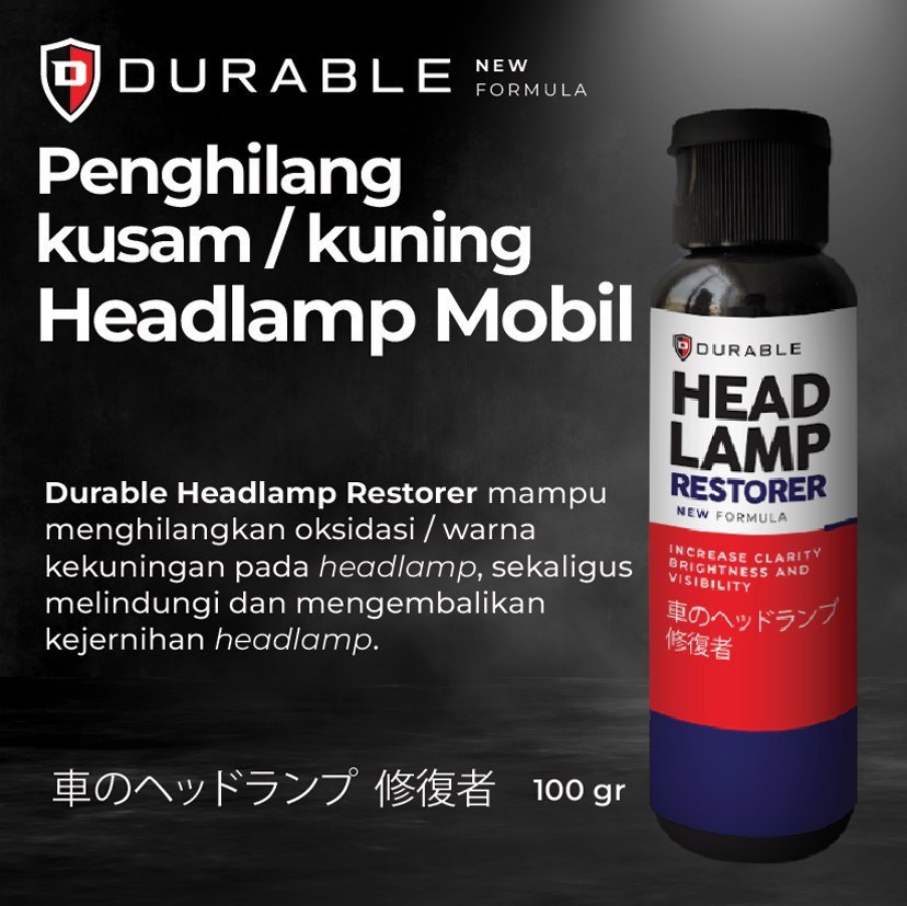 Durable Head Lamp Restorer dapat membantu Anda mengatasi masalah tersebut. Cairan ini membantu menghilangkan noda kuning di mika head lamp mobil Anda sehingga lampu depan mobil dapat terlihat lebih terang dan penampilan mobil kembali menjadi bagus.